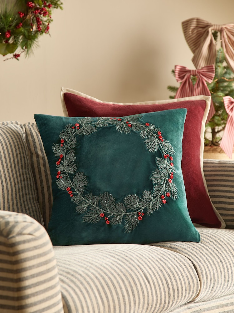 ホリデーシーズンにぴったりのベルベットの深い緑のクリスマスリース刺繍デザインが特徴。